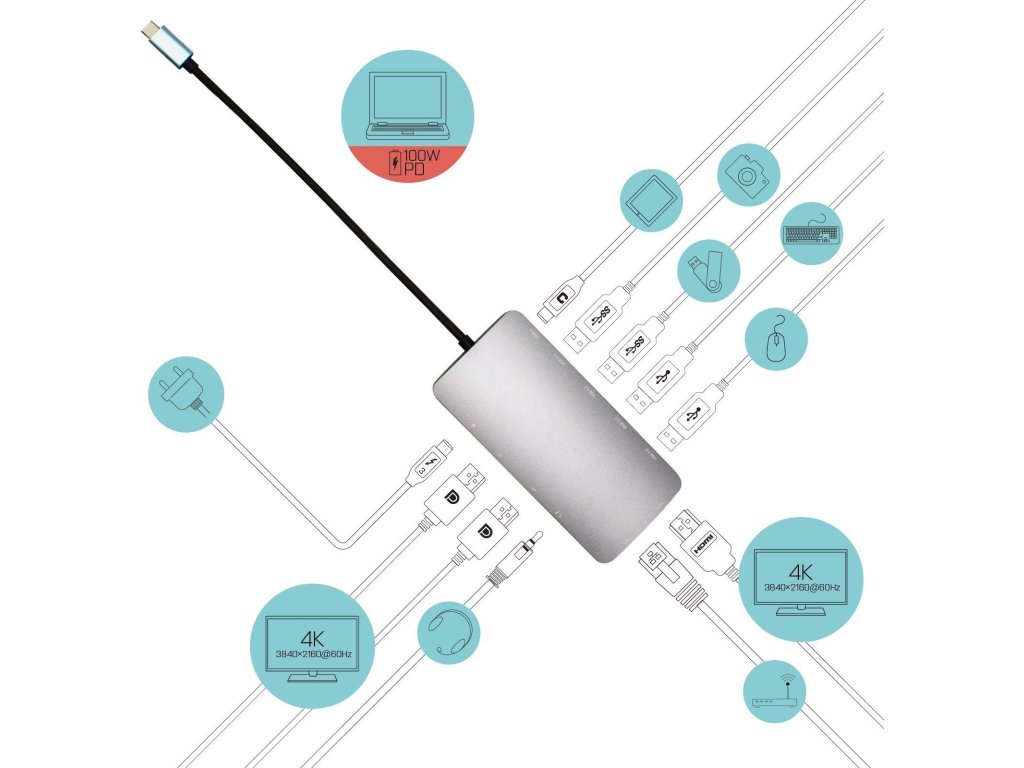 Malá kovová USB-C dokovací stanice, která dokáže připojit až tři externí monitory*. Jednoduše připojte váš notebook či tablet (instalace ovladačů není nutná) a využijte rychlého datového USB, připojení k internetu prostřednictvím LAN portu, spolu s možností připojit vaše sluchátka a mikrofon. Samozřejmostí je podpora napájení vašeho notebooku, a to až do 100 W, což znamená, že budete schopni nabít všechny notebooky a tablety, které nabíjení prostřednictvím USB-C (USB-C Power Delivery) podporují.