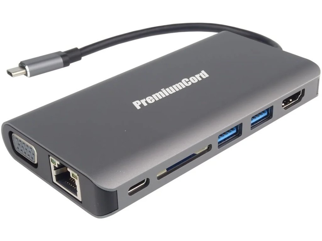 PremiumCord Převodník USB-C na HDMI + VGA + RJ45 + 2xUSB3.0 + SD card + 3,5mm + PD charge, hliníkové pouzdroTento adaptér umožňuje vysoce kvalitní převod videa a zvuku z USB 3.1 konektoru typu C současně na HDMI a VGA konektor pro monitor/TV/projektor. Funguje jako externí grafická karta s výstupem HDMI a VGA. Je možné zapojit monitor na oba grafické výstupy současně. Umožňuje připojit další USB zařízení a nabíjet přes PD konektor. Adaptér připojí na síť ethernet rychlostí 1Gbps.Adaptér obsahuje čtečku SD karet a audio výstup stereo jack 3,5mm.