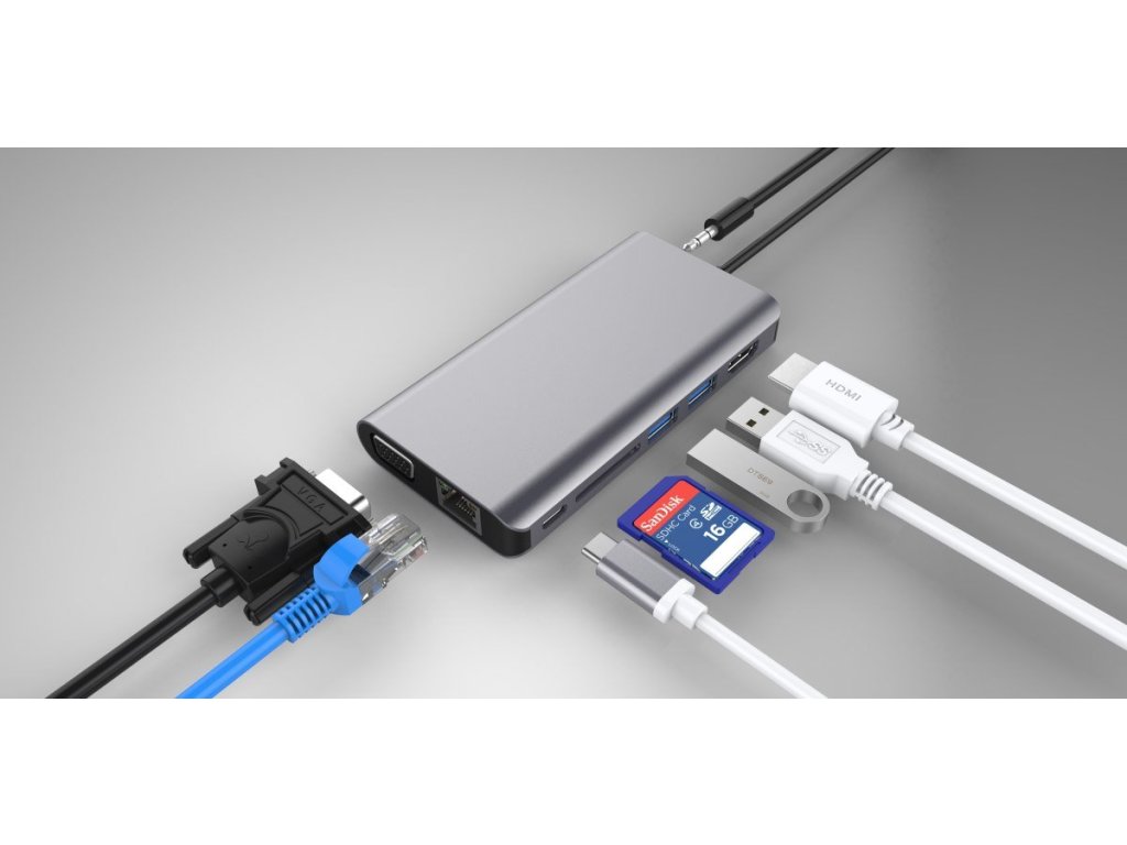 - Dokovací stanice umožňuje připojit zařízení,notebook,telefon s USB-C k HDMI a VGA monitoru, dále připojit dvě USB 3.0 periferie, připojit k síti lan, číst SD karty, připojit sluchátka či jiné audio zařízení a pomocí PD charge nabíjet nebo napájet