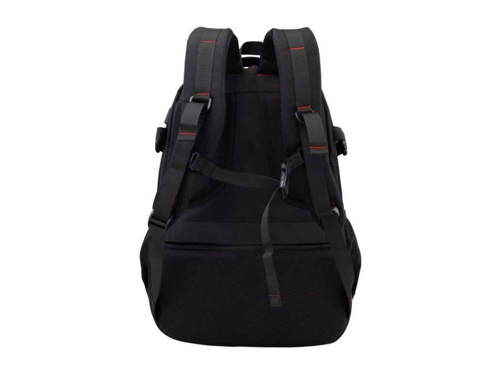 Design v černé barvě s červenými detaily podtrhuje herní charakter batohu.